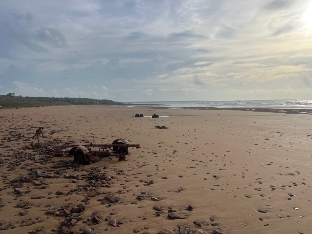 An auspicious day for black Australians and there’s a march planned through the youth program which is facilitated in various Arnhem Land communities by energetic and switched on young white women we’ve met at head office. However dense tropical downpours pretty much put paid to that plan and our anticipated Invasion Day outing- so it’s another quiet day at home recovering from the effort in getting here topped off with our usual 5.30 pm walk on the beach. A stream of fresh water is pouring into the sea at one end after the recent rains. The odd salt rusted vehicle or trailer chassis protrudes from the sand. With these objects, rather than unfortunate mishap, there’s more a sense of something coming to the end of it’s natural life and just taking a bit longer than your average natural object to decompose. It’s a refreshing values statement in the face of our over insured whitefella material possession preciousness backed up by the technology to rescue us from any mishap. A clear statement that material possessions are not king.